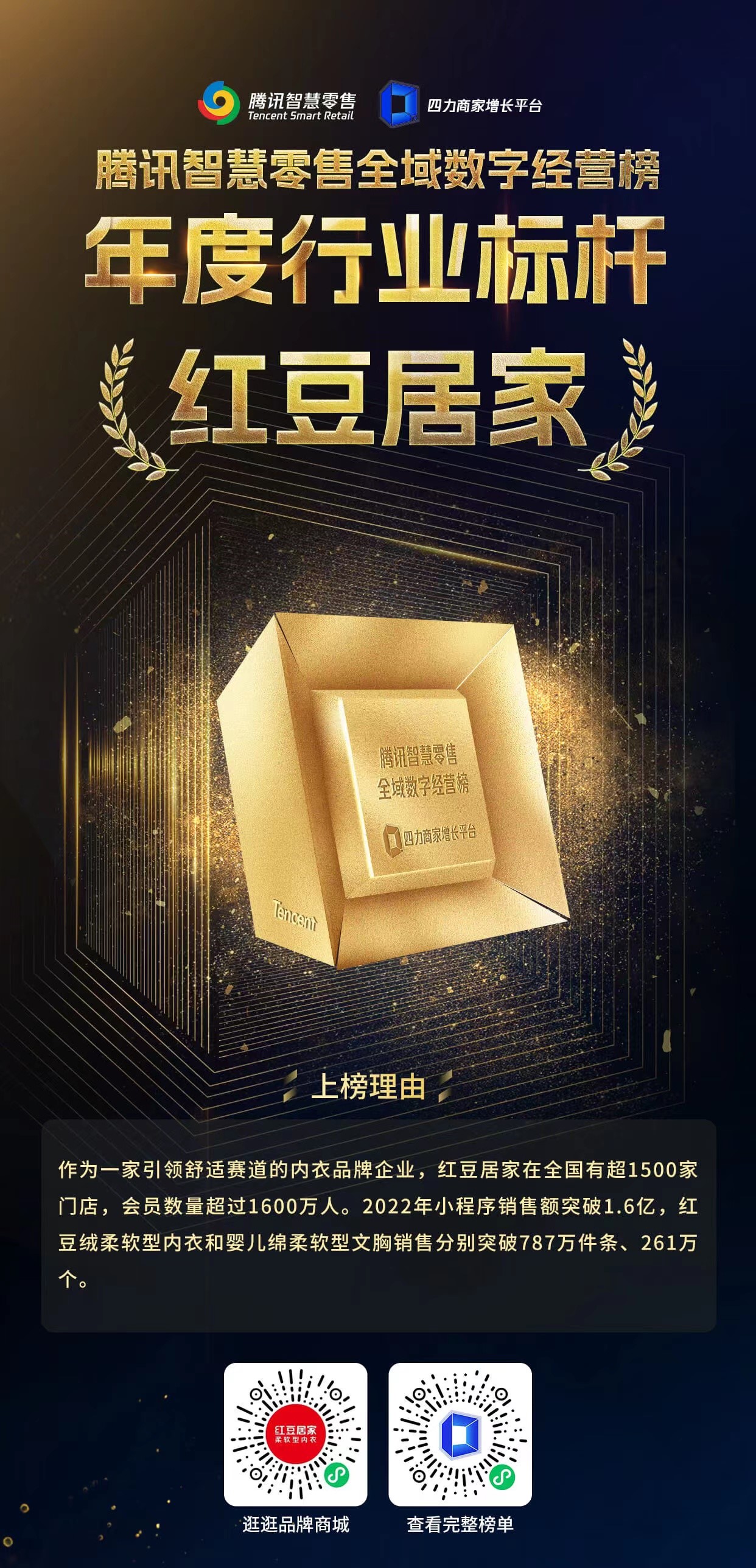 近日,由騰訊聯合《哈佛商業評論》中文版及多領域專家,大中華區艾菲等頭部機構聯袂推薦,2022騰訊智慧零售全域數字經營榜發布。紅豆居家憑