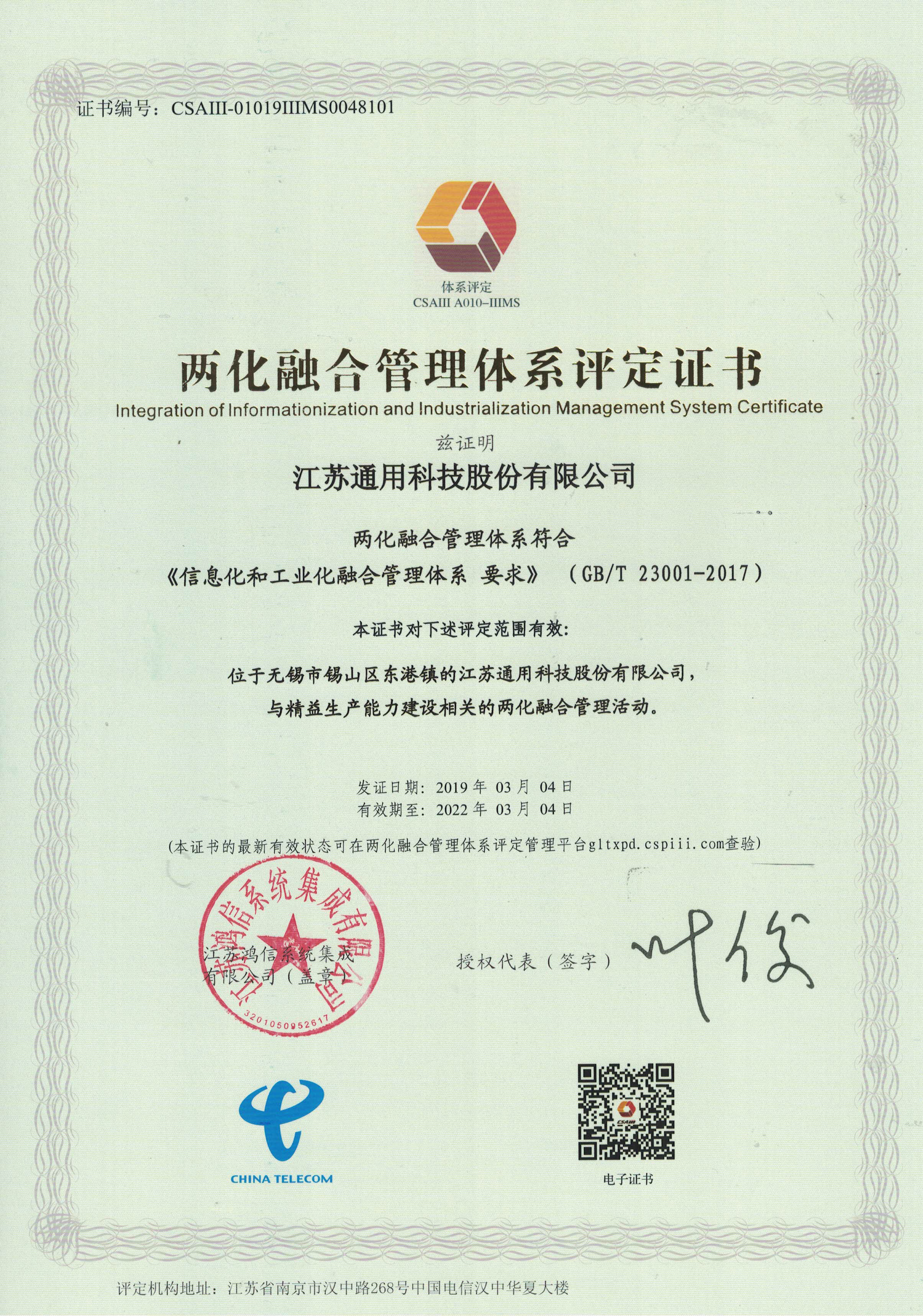 近日,通用股份順利通過國家兩化融合管理體系評定并獲得證書,評定范圍是與精益生產能力建設相關的兩化融合管理活動,標志著公司在推