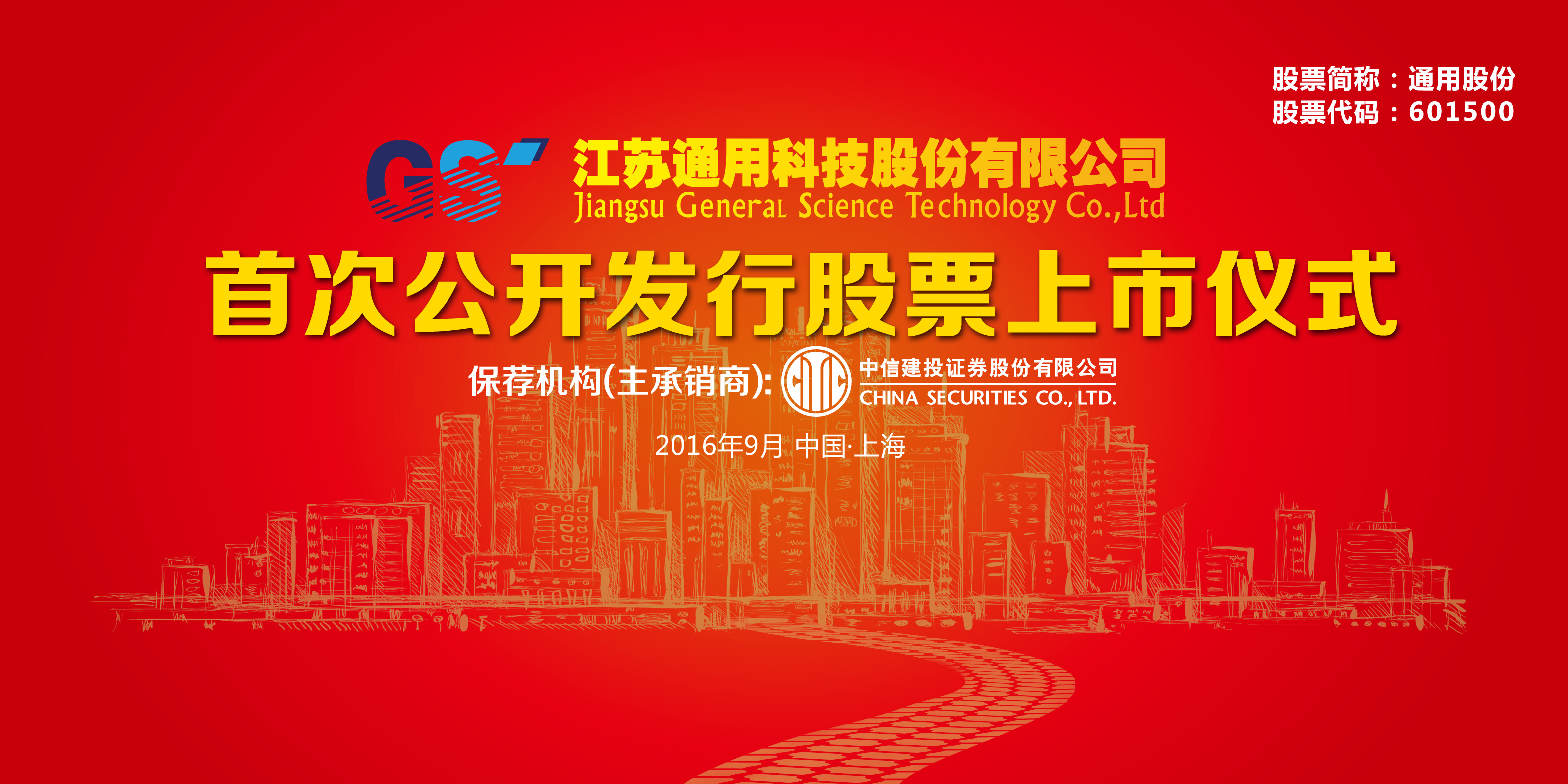 9月19日,江蘇通用科技股份有限公司首次公開(kāi)發(fā)行A股上市儀式在上海證券交易所隆重舉行,隨著開(kāi)市鳴鑼,標(biāo)志著通用股份(股票代碼:601500)