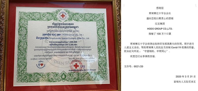 柬紅會舉行紅豆集團捐贈100萬口罩接收儀式 我謹向您(周海江)致以最衷心的感謝……就如此句所說:‘守望相助,中柬同心’