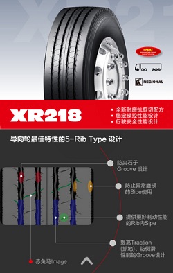 其中XR218采用全新耐磨抗剪切配方,更加穩(wěn)定的操控性能設(shè)計(jì),以及保障行駛安全性能設(shè)計(jì)。其導(dǎo)向輪采用了5—Rib Type設(shè)計(jì),包括防夾石子Groove設(shè)計(jì);防止異常磨損的Sipe使用;提供更好制動(dòng)性能的Rib內(nèi)Sipe;以及提高Traction(抓地)、防側(cè)滑性能的Groove設(shè)計(jì)。