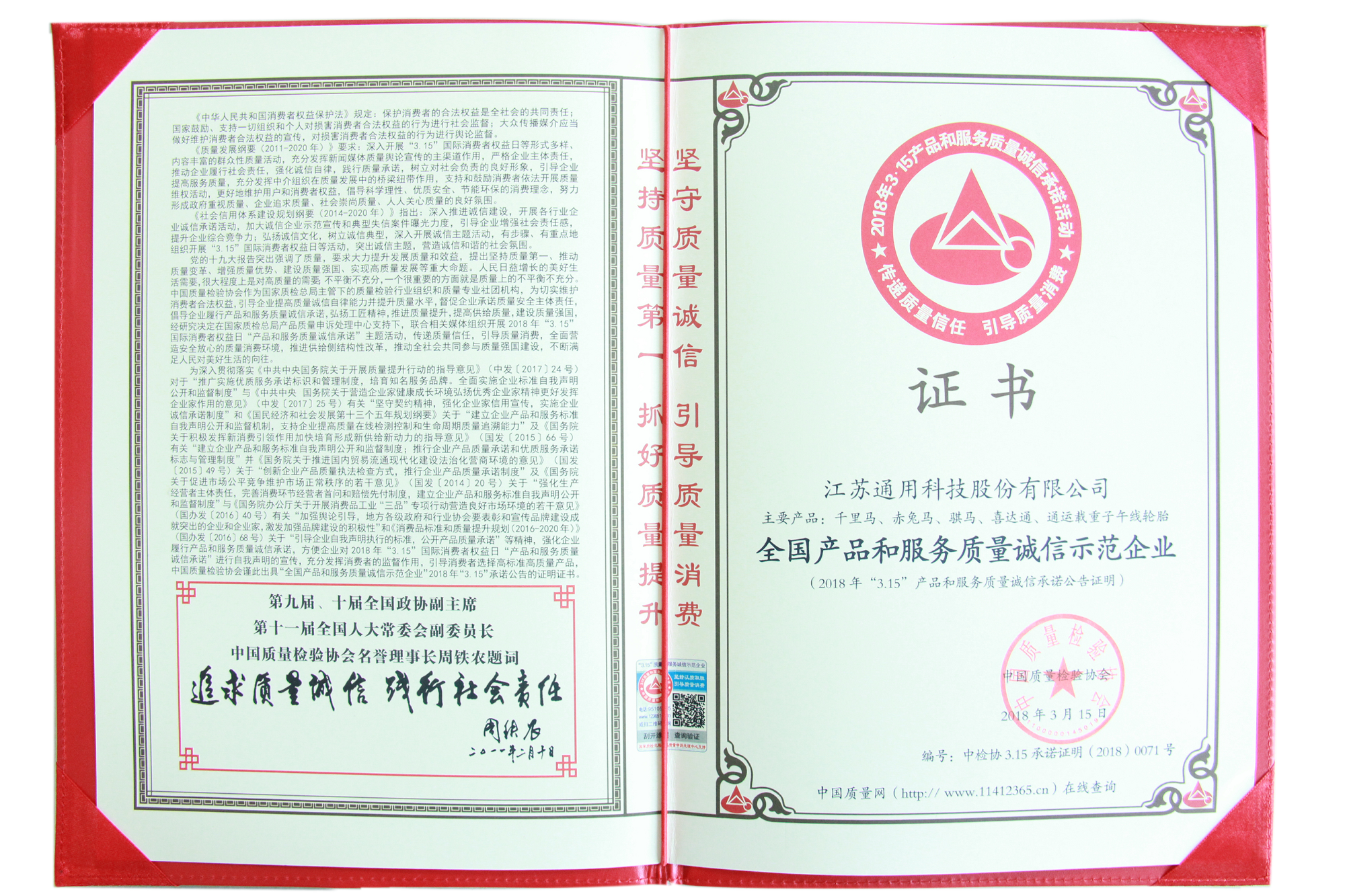 江蘇通用科技股份有限公司自創(chuàng)建以來,高度樹立“產(chǎn)品即人品”的經(jīng)營理念,緊緊圍繞“全員追求卓越、匠心打造精品”的質(zhì)量方針,致力于為消費者提供更優(yōu)性價比的輪胎產(chǎn)品。近日,通用股份憑借旗下五大品牌的卓越品質(zhì)以及真誠服務(wù),在由國家質(zhì)檢總局和中國質(zhì)量檢驗協(xié)會聯(lián)合開展的“產(chǎn)品和服務(wù)質(zhì)量誠信承諾”主題活動中,榮獲“全國產(chǎn)品和服務(wù)質(zhì)量誠信示范企業(yè)”、“全國輪胎行業(yè)質(zhì)量領(lǐng)先品牌”稱號,彰顯了通用股份以質(zhì)立信、誠信為本的行業(yè)操守。