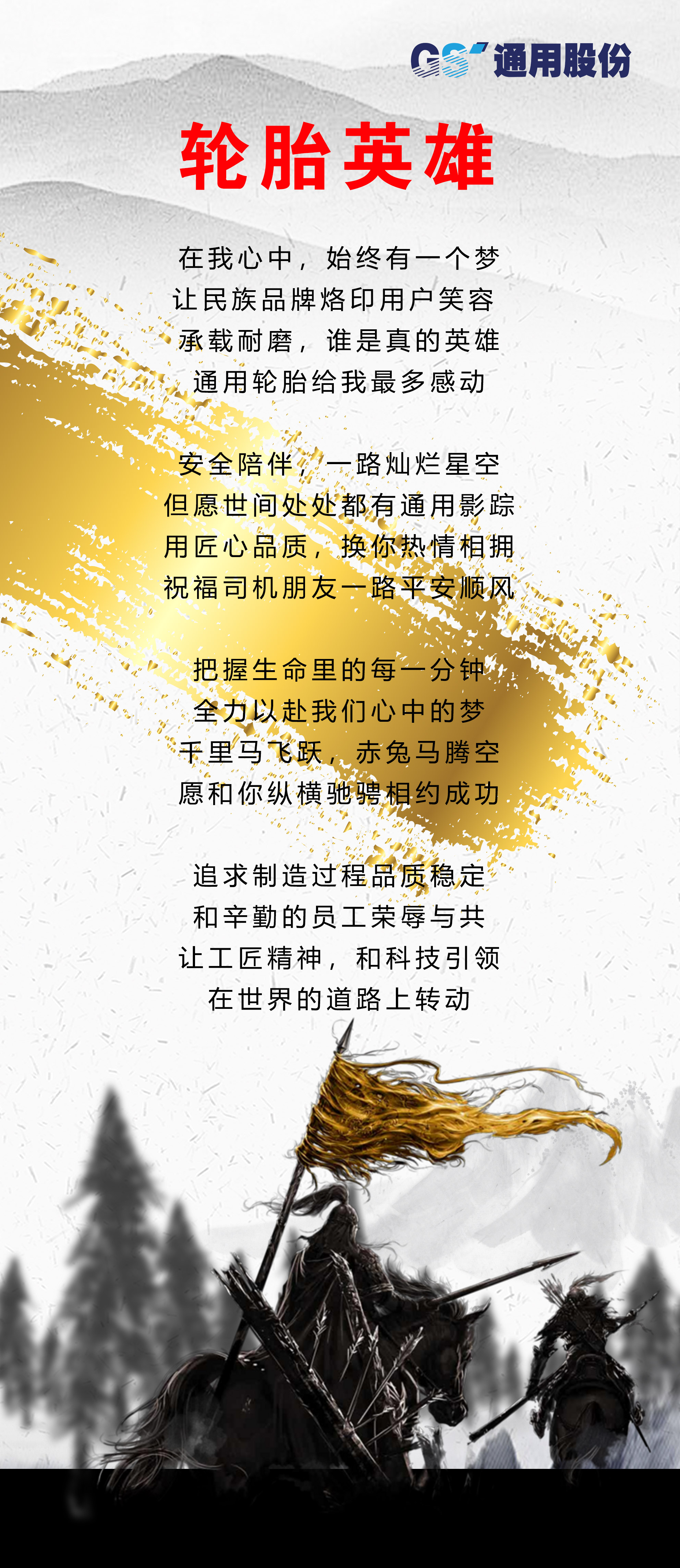 今年9月是中國第四十一個“質量月”,也是通用股份第十四屆“科技質量月”。滄海橫流,自強不息,方顯英雄本色。今年,通用股份以一首創編的《輪胎英雄》拉開了“科技質量月”的帷幕,在這個風起云涌的競爭時代,全體通用人堅守初心,以振興民族品牌為己任,為向廣大消費者提供更加卓越的產品與服務而不斷努力奮斗,推動企業邁向高質量發展。
