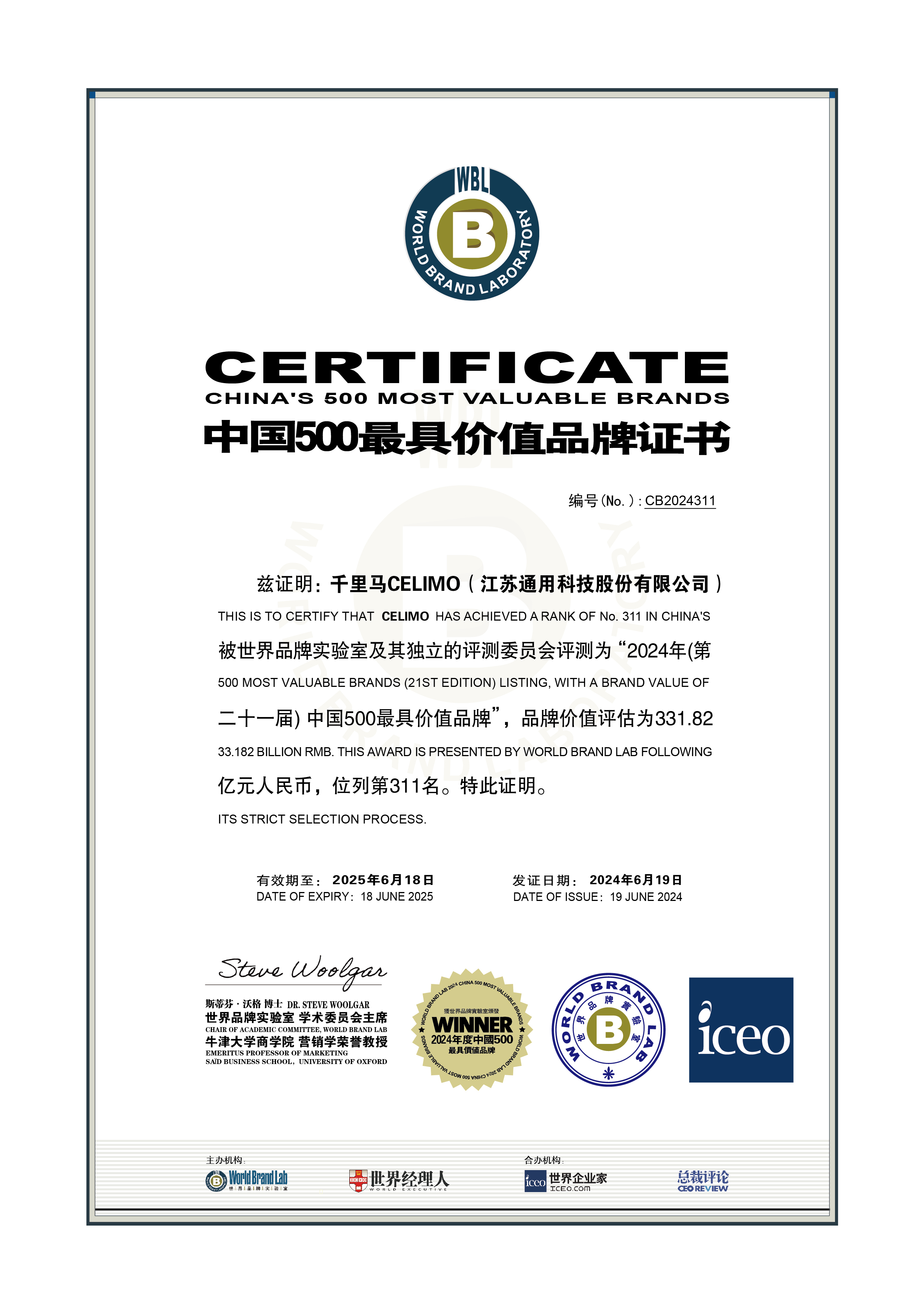 6月19日,世界品牌實驗室(World Brand Lab)主辦的第二十一屆“世界品牌大會”在京圓滿落幕。會上隆重揭曉了2024年“中國500最具價值品牌”榜單,通用股份旗下千里馬CELIMO品牌憑借331.82億元人民幣的品牌價值,排名躍升至榜單第311位,連續(xù)六年獲此殊榮,彰顯了其強(qiáng)大的品牌實力。
