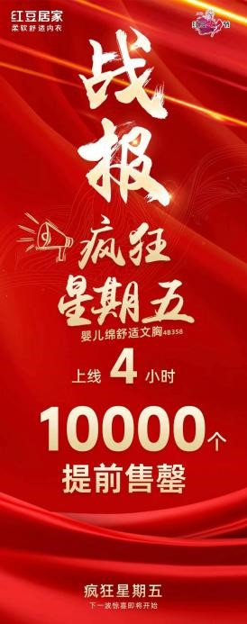 紅豆有禮,約“惠”七夕。7月下旬,在第24屆紅豆七夕節(jié)IP的強(qiáng)力加持下,紅豆居家通過精心策劃的“瘋狂星期五”營銷活動(dòng),每周精選一款兼顧舒適悅己與高性價(jià)比優(yōu)勢(shì)的品質(zhì)好物,限時(shí)秒殺、限量搶購,掀起了現(xiàn)象級(jí)消費(fèi)熱潮。首波主推的嬰兒綿舒適文胸在短短10小時(shí)內(nèi)狂銷1萬件,第二波活動(dòng)更攀新高,創(chuàng)下4小時(shí)售罄1.2萬件文胸的驕人戰(zhàn)績,再次證明了“紅豆”品牌背后的硬核產(chǎn)品力和強(qiáng)大市場(chǎng)吸引力。